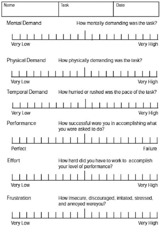 - Hart, S.G.; Staveland, L.E. Development of NASA-TLX (Task Load Index): Results of Empirical and Theoretical Research. Adv. Psychol. 1988, 52, 139–183. [Google Scholar] [CrossRef]