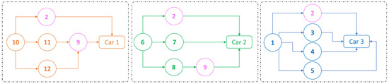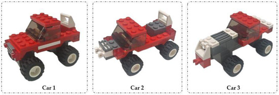 In this study, three different products were used to carry out the assembly process: Car 1, Car 2, and Car 3. These products are illustrated in Figure 2. The case study concerns the manual assembly of these products.