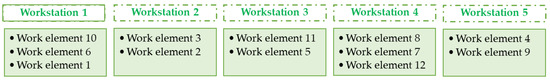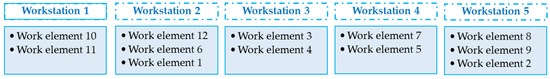 The initial balancing was performed in two ways. In the first case, the assembly time values of the work elements were used as the criterion for balancing the assembly line, while in the second case the complexity values of the work elements () were used as the criterion for balancing the assembly line.