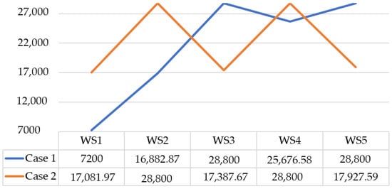 In Case 1, the values of the total assembly time per workstation vary considerably, from 7200 s at the first workstation (WS1) to 28,800 s for workstations 3 (WS3) and 5 (WS5), which indicates a large discrepancy in workstation capacity utilization. In Case 2, although there are also fluctuations, the values are closer to the maximum capacity, and the differences are not so pronounced. It can therefore be seen that balancing according to the complexity criterion (Case 2) creates a more even basis for optimization, which leads to a higher overall output and a more even distribution of the workload across the workstations. Balancing by assembly time (Case 1), on the other hand, led to greater load differences between workstations and to smaller total production quantities after optimization. This confirms the importance of carefully defining the initial solution in the optimization process, especially in a human-centric context.