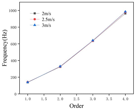 The performance of a piping system is closely linked to the fluid flowing through it. In certain applications, while the fluid type and pump remain unchanged, flow rate adjustments are often required to meet varying operational demands. However, altering the flow rate inevitably affects the internal pressure of the pipeline, thereby impacting the system’s overall performance. Consequently, analyzing the influence of flow rate on pipeline performance is of critical importance. In this study, the finite element software ANSYS Workbench (2023) was employed to analyze the modal changes of the pipeline under different flow rates. As shown in Figure 2, the pipeline’s modal characteristics do not exhibit significant changes when subjected to flow rates of 2 m/s, 2.5 m/s, and 3 m/s. The magnitude of these variations is within approximately ±3%.