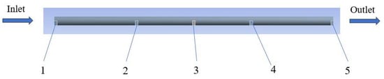 Pipelines are typically secured to substrates using pipe clamps and similar fixtures to provide support. This not only fixes the pipelines in place but also helps dampen vibrations and restrict pipeline deformation at the support points. To improve the stability of the pipeline experimental system, simulations were conducted to analyze the impact of support layout on the pipeline system, with the goal of identifying a more rational configuration. As illustrated in Figure 4, the simulation focused on a 1 m straight pipeline equipped with five support points along its length from the inlet to the outlet. Pipeline vibration was analyzed by evaluating different support point combinations: two supports (Points 1–5), three supports (Points 1–3–5), four supports (Points 1–2–4–5), and all five supports. The aim of this analysis was to understand how these layout variations influence pipeline vibration.