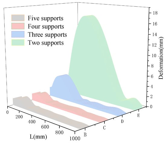 As presented in Figure 5, the simulation results reveal that the pipeline’s maximum vibration displacement decreases as the number of support points increases and this decreasing trend is more marked when the number of supports is smaller. Regardless of the number of supports, the pipeline’s maximum vibration displacement consistently occurs between the two supports nearest to the input end. For configurations with four or five support points, the vibration curves exhibit little variation due to significant overlap in support point positions; however, these layouts still conform to the vibration observed in other support configurations. Therefore, to enhance the stability of the piping system, reinforcing the pipeline’s input end can effectively reduce its maximum vibration displacement.