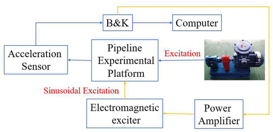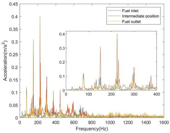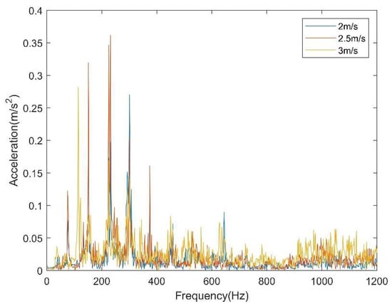 The experimental principle is shown in Figure 8. Firstly, according to the scheme mentioned earlier, the sensors are arranged, and the speed of the gear type hydraulic oil pump is set by a frequency converter to achieve three working states of hydraulic oil flow velocity distribution inside the pipeline: 2 m/s, 2.5 m/s, and 3 m/s. The time response data of the pipeline is collected by the B&K system through the sensors under three working conditions. Then, the collected data is Fourier transformed by MATLAB (R2018b) software to obtain the vibration amplitude frequency curves of the pipeline at three flow velocities. The results are shown in Figure 9 and Figure 10.