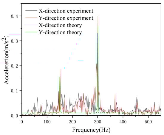 Figure 12, Figure 13, Figure 14 and Figure 15 present comparisons between experimental results and theoretical analysis outcomes under four conditions: no excitation, axial excitation, radial excitation, and combined axial-radial dual excitation. From the positions of experimental and theoretical resonance peaks in these figures, it is evident that the introduction of external excitation has no effect on the modal characteristics of the experimental platform, its first and second modal frequencies remain around 150 Hz and 310 Hz, respectively. Figure 12 shows the comparison between experimental and theoretical results without excitation. Due to external interference, the acceleration amplitude measured in the experiment is relatively large, particularly with a prominent resonance peak appearing near the 150 Hz resonance frequency. At this point, the discrepancy between experimental and theoretical results is significant. After applying a 100 Hz sinusoidal excitation to the axial direction of the experimental platform, Figure 13 clearly shows that the vibration curve exhibits a distinct peak at the same frequency, with the detected acceleration increasing by 2–3 m/s2 compared to the unexcited condition—indicating that the piping system has undergone resonance. The application of axial excitation significantly enhances the amplitude in both X and Y directions; the maximum vibration acceleration outside the resonance region is nearly doubled, reaching approximately 0.5 m/s2. As shown in Figure 14, the application of sinusoidal excitation in the radial (X-direction) increases the amplitude in the X-direction for both experimental and theoretical results, demonstrating that external excitation applied in a specific direction directly affects vibration outcomes in that direction. However, compared to the amplitude enhancement in the X-direction, radial (X-direction) excitation has a smaller impact on the Y-direction amplitude, and even exerts a certain damping effect at higher frequencies. Figure 15 shows that when axial and radial excitations are applied simultaneously, the pipeline’s vibration curve combines the characteristics of the two individual excitation conditions. Vibrations in both X and Y directions are somewhat enhanced, but still only reach approximately 60% of the amplitude observed under axial excitation alone—consistent with theoretical analysis results. Reference [32] analyzes the fluid–structure interaction characteristics of straight pipelines by measuring vibration levels via pipeline wall displacement. It concludes that both axial and radial additional excitations significantly affect pipeline vibration at lower frequencies (especially below 400 Hz), with the vibration trend gradually slowing as frequency increases—consistent with the experimental results obtained in this study.