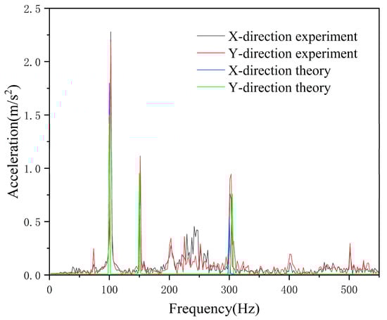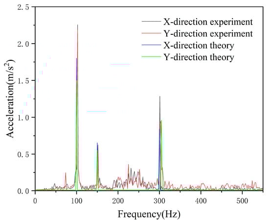Marine vessels operate in the ocean and are subject to complex marine environments. In addition to vibrations caused by fluid flow, the on-board hydraulic pipeline systems are also affected by various external vibrations including vibrations from transmission equipment, wave impacts on the hull, and the effects of marine organisms on the hull, all of which influence the pipeline’s vibration characteristics. Therefore, when analyzing hydraulic pipeline systems installed on marine vessels, not only should their intrinsic vibrations be considered, but also the impact of external interference. This study uses an electromagnetic shaker to simulate external interference and analyzes the influence of the external environment on pipeline vibration characteristics through sinusoidal excitations applied in different directions. Specifically: An accelerometer was attached to the pipeline parallel to the surface of the experimental platform base to measure vibrations in the X-direction; Another accelerometer was attached to the pipeline perpendicular to the platform base surface to measure vibrations in the Y-direction. A 100 Hz sinusoidal interference signal was generated by the electromagnetic shaker, and pipeline vibration characteristics were analyzed under three conditions: unidirectional axial interference, unidirectional radial interference, and simultaneous unidirectional axial and radial excitation. The experimental principle is schematically illustrated by the yellow line in Figure 8. The electromagnetic shaker was controlled using a B&K system and power amplifier to apply a sinusoidal excitation force to the pipeline experimental platform. Vibrations were then measured via the accelerometers; finally, the collected time-domain response signals were converted using FFT (Fast Fourier Transform) in MATLAB (R2018b) software to obtain the vibration amplitude-frequency curves of the pipeline under external excitation. Comparisons between the experimental results and theoretical numerical analysis results are presented in Figure 12, Figure 13, Figure 14 and Figure 15.
