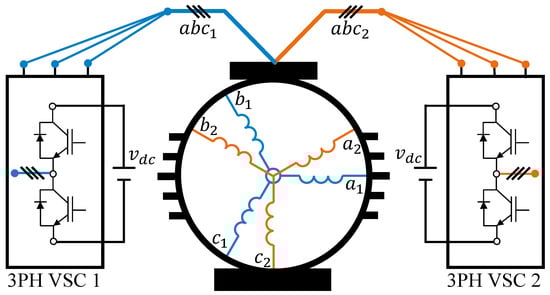 The selected ED is formed by two main elements: a six-phase induction machine (6ph-IM) and a double three-phase two-level voltage source converter (VSC). Focusing on the 6ph-IM, this electric motor presents two three-phase windings spatially shifted 30°, and two isolated neutral points (see Figure 1). On the other hand, each three-phase stator winding is fed by one of the two three-phase VSCs, providing available switching states. The switching states applied by the VSC are determined by the combination of the states of the individual switches, , where i ranges from a to c and j denotes the corresponding VSC module. Each VSC phase consists of two complementary switches. When , the top switch is ON (conducting), while the bottom switch is off. The stator phase voltages () are derived as follows: