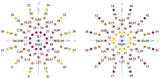 After this change of reference frame, the voltage vectors produced by each switching state can be classified according to its modulus in the main subspace in five groups: large (), medium-large (), small (), and null (). These voltage vectors are shown in Figure 2, where an annotation marks the number produced by the vector composed of .
