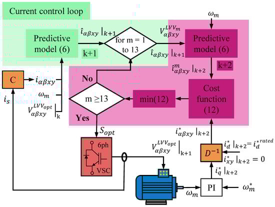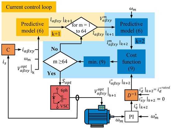 In the case of variable-speed EDs, model predictive control is characterized by two regulation loops, as shown in the diagram of Figure 3. The external control loop focuses on tracking the reference mechanical speed (), and it is governed by a proportional-integral (PI) controller that provides the q reference current (). The remaining reference currents are typically specified as follows: adjusted to ensure rated flux while both and set to zero when harmonic injection is not desired. The internal control loop aims to regulate these currents and is implemented using the following model of the 6ph-IM: