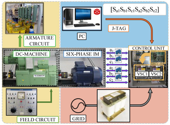 The experimental rig employed in the presented work is depicted in Figure 6. The 6ph-IM described in Section 2 is fed by two VSCs (Semikron SKS22F, Nuremberg, Germany) connected to the grid via one transformer. Its rectification stages provide two dc links of the same voltage. As for the machine itself, its parameters have been determined using the ac time-domain and stand-still tests when the motor was fed by an inverter [56,57]. Their values, alongside the parameters which define the performed tests in terms of control, are shown in Table 1. The 6ph-IM is coupled to a dc machine serving as a generator, with an armature circuit presenting variable resistances to dissipate energy. Due to the described configuration, the load of the 6ph-IM is speed-dependent. Focusing on the control algorithms employed in this work, they have been developed on Texas Instrument’s proprietary software (Code Composer Studio 5.3.0, Texas Instrument, Dallas, TX, USA), and later implemented in the digital signal processor of the same company (TMS320F28335, Texas Instrument, Dallas, TX, USA) through a JTAG interface. The information required to close the control loops is provided by two types of sensors: an optical encoder to obtain mechanical speed (GHN510296R, Hohner Automation, Frankfurt, Germany) and four Hall-effect sensors (LEM LAH 25-NP, Meyrin, Switzerland) to measure stator currents. With the objective of obtaining a more complete depiction of the current harmonic spectrum, the phase currents depicted in this section have been measured with a different setup. Four Hall-effect sensors, model BK PRECISION CP62 (BK PRECISION, Yorba Linda, CA, USA), feed the acquired information to an oscilloscope (Yokogawa DL850 ScopeCorder, Tokyo, Japan), recording at a rate of 200,000 samples per second, a sampling time of 5 s. This information is transferred offline to a PC through a USB drive and processed through the software MATLAB 2023a.