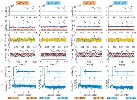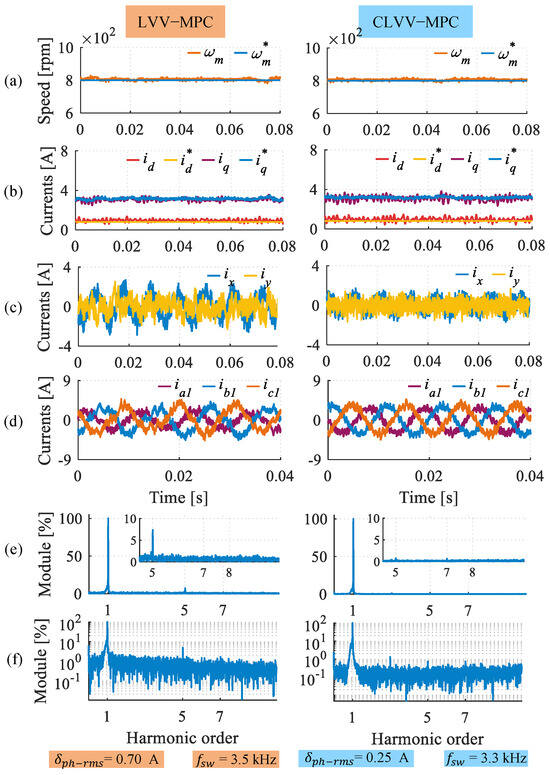 The results of the first set of tests are displayed in Figure 7, with the two left columns depicting the machine performance at 500 rpm and the two right columns at 800 rpm. By observing Figure 7a,b, the correct tracking of reference speed and currents in the plane can be confirmed for both schemes and operating points. However, stark differences appear when comparing currents (Figure 7c) and phase currents (Figure 7d). CLVV-MPC achieves lower harmonic injection at low and high speed, leading thus to lower HDI values. At 500 rpm, this metric registers a relative reduction of 54%, while is maintained. At 800 rpm, HDI is reduced by 35% while drops lightly by 9%. This improvement can also be observed by employing the fast Fourier transform (FFT) on the phase currents (Figure 7e,f). While the harmonic content is reduced in a general manner, the greatest improvement comes in the reduction of the fifth harmonic, which is reduced from 4.56% to 1.88% at 500 rpm and from 4.57% to 1.25% at 800 rpm. The discussed quality metrics are collected in Table 2, alongside the THD values of phase currents. In summary, closing the regulation loop of the secondary currents is key to ensuring phase current quality in the whole operating range and, if correctly tuned, it does not imply notable worsening of primary-currents tracking.