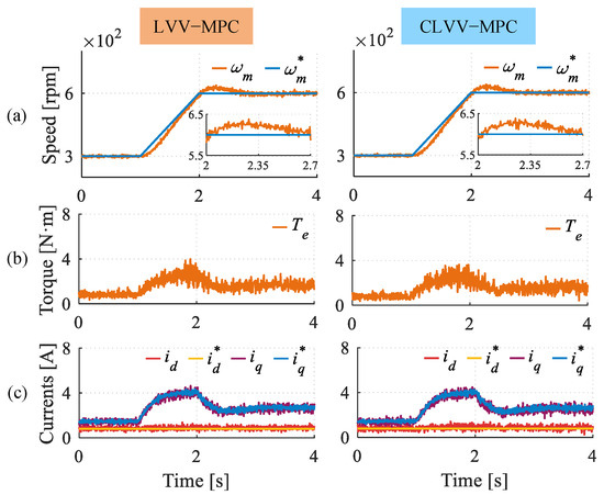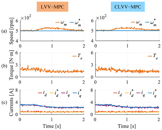 Dynamic response of LVV-MPC and CLVV-MPC. (a) Speed tracking, (b) estimated electromagnetic torque, and (c) currents.