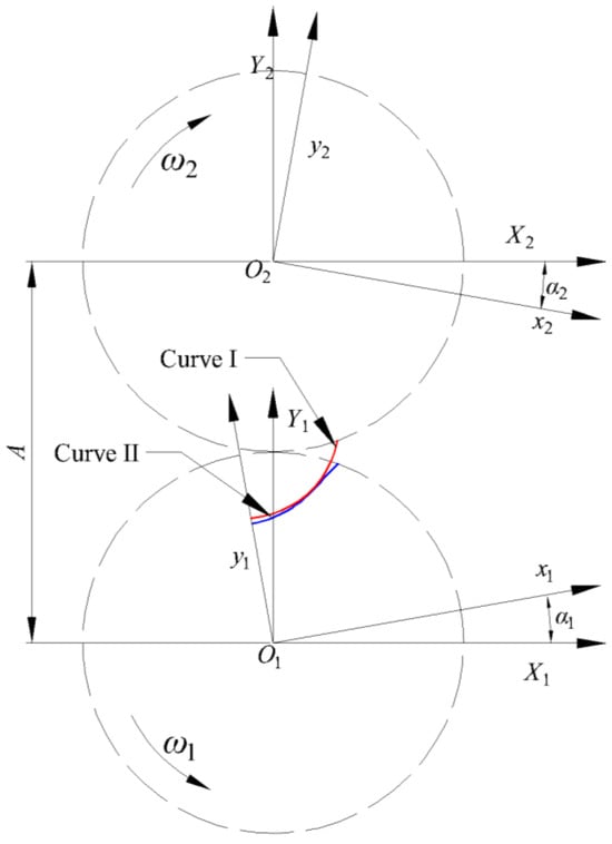 The arc-shaped rotor is primarily composed of a circular arc segment and its conjugate curve, as illustrated in Figure 1. Therefore, to fully delineate the rotor’s profile, it is necessary to derive the equation of the conjugate curve. Among the available methods, coordinate transformation provides an efficient approach for determining the conjugate curve. To obtain the conjugate curve using coordinate transformation, it is essential to establish two static coordinate systems and two moving coordinate systems, as depicted in Figure 2.