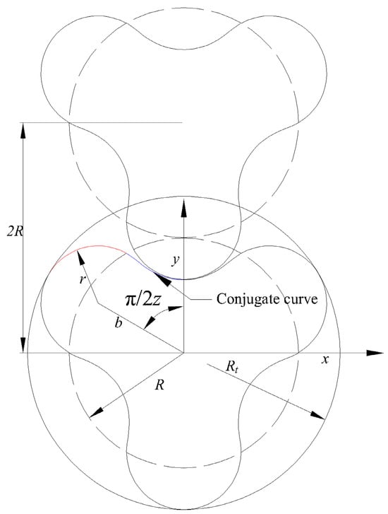 After determining the envelope curve of the arc, the complete geometry of the arc rotor can be generated based on this result. Figure 3 illustrates the arc and the corresponding envelope curve for a three-lobe arc rotor. In Figure 3, Rt denotes the radius of the addendum arc, and R represents the pitch circle radius. However, there are some limitations of conventional arc-shaped rotors have been identified in both theoretical analysis and practical applications. Due to the discontinuity in curvature between adjacent arc segments, which can lead to increased leakage and reduced volumetric efficiency. As constant-radius arcs limit the potential for profile refinement and do not easily accommodate varying operating conditions. Resulting from abrupt curvature transitions that negatively affect the fluid dynamics in compression or expansion chambers. To overcome these shortcomings, the original arc segments are replaced with variable-radius arcs, allowing for a smoother curvature transition along the rotor profile. In addition, an addendum arc is introduced at the tooth tip to refine the sealing region and reduce clearance losses. Through this, it can improve sealing performance, especially at the tooth tips, leading to enhanced volumetric efficiency. Smoother conjugate curves, which facilitate better meshing with the mating rotor and reduce design complexity.