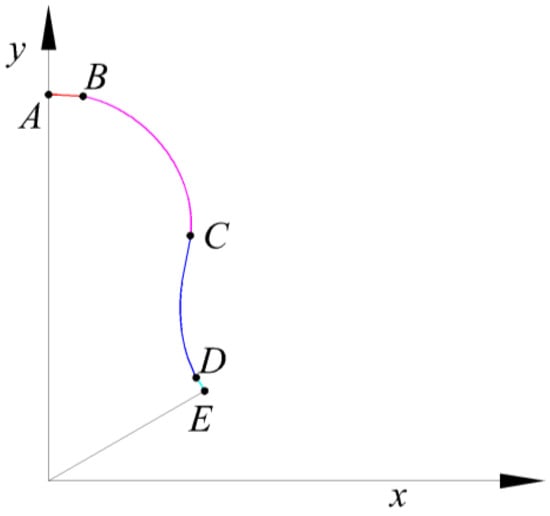 The new rotor profile is shown in Figure 5. In this profile, segment AB is an addendum arc (tooth tip arc), segment BC is a variable-radius arc, segment CD is the envelope curve corresponding to segment BC, and segment DE is the envelope of segment AB. The parametric equations for each segment are given as follows: