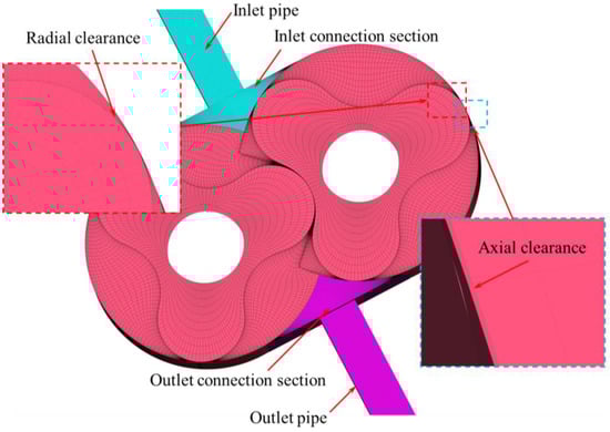 Given that the pump under investigation adopts a straight-bladed three-lobe Roots rotor, which features periodic rotational symmetry and regular geometry, the stationary and rotating domains were meshed independently using structured hexahedral elements. This approach enhances numerical accuracy and solution stability, particularly important for complex transient simulations. Structured grids help minimize numerical diffusion and mesh-induced errors, making them ideal for capturing detailed flow features within regularly shaped rotating machinery. For the rotating domain, its mesh generation fully considers the time-varying geometry caused by rotor rotation. Since the three-lobe rotor completes one full operational cycle every 120° of rotation, the complete rotation cycle was discretized into 60 time steps, corresponding to 2° per step. Accordingly, a set of structured grids was generated for each rotational increment, resulting in 60 dynamic mesh files in total. During the unsteady simulation, these mesh files were read and applied sequentially based on time steps, thereby realizing accurate dynamic representation of rotor motion and enabling the capture of transient flow features within the pump. To further improve simulation fidelity, local mesh refinement was applied to critical clearance regions-specifically, the clearances between rotor blades and the chamber, as well as between adjacent rotors. These regions are prone to complex flow phenomena such as leakage flows, strong shear layers, and steep pressure gradients. Mesh refinement in these areas enhances the model’s ability to resolve such fine-scale effects, improving the overall reliability of the simulation results. Data communication between the stationary and rotating domains, as well as between the inlet and outlet connection regions, was facilitated via interfaces, which maintain physical continuity and numerical consistency across different mesh zones. This strategy ensures seamless coupling of the computational domains, essential for resolving the strongly coupled fluid–structure interactions inherent in rotating machinery.