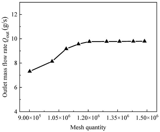 As shown in Figure 7, the flow rate converges as the mesh size increases, with the variation progressively decreasing. When the mesh node count reaches about 1.2 million, changes in results are controlled within 1%, and further mesh refinement no longer significantly affects the outlet mass flow. This indicates that the numerical results have effectively become independent of mesh resolution, meeting the mesh independence criteria. Considering both computational accuracy and resource expenditure, a mesh model comprising 1,205,889 cells was selected as the basis for subsequent simulations in this study.