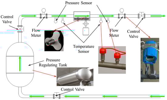 To accurately validate the numerical simulation results, a dedicated experimental test rig was specifically designed and constructed to perform external characteristic tests on the hydrogen circulation pump. During the experimental campaign, multiple critical parameters including volumetric flow rate, pressure, and temperature were measured with high precision using calibrated instrumentation. The test platform integrates a comprehensive measurement system, enabling real-time data acquisition and control, with the schematic diagram and photographs of the apparatus illustrated in Figure 8. This advanced testing facility provides a robust and systematic approach to evaluating the pump’s performance, thereby ensuring the fidelity of the simulation model and its applicability to real-world operating conditions.