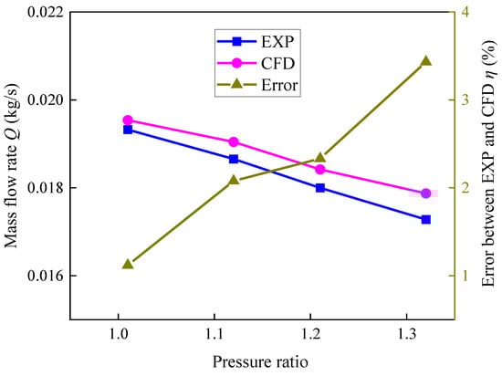 Figure 9 presents a comparative analysis between the experimentally measured average flow rates and the numerically simulated results of the hydrogen circulation pump under varying pressure ratios. As illustrated, the simulation data closely align with the experimental measurements across all tested pressure ratios, demonstrating good agreement and validating the accuracy of the numerical model. Quantitatively, the deviations between simulation and experiment remain within 5% for all five pressure ratio conditions examined. Notably, at a pressure ratio of 1.01, the relative error is as low as approximately 2%. Although the discrepancy between simulated and measured flow rates tends to slightly increase with rising pressure ratios, the error margins remain well within acceptable engineering limits. This slight growth in error may be attributed to factors such as experimental uncertainties, simplifications in boundary condition assumptions, or turbulence modeling limitations under higher backpressure scenarios. Nevertheless, the overall consistency between the two datasets confirms that the current numerical simulation framework reliably captures the complex internal flow phenomena within the hydrogen circulation pump, including leakage flows and flow separation. These results substantiate the effectiveness of the employed CFD approach for accurately predicting pump performance over a range of operating conditions, providing a solid foundation for its application in design optimization and operational analysis of hydrogen circulation systems. Therefore, the numerical model used in this study can be confidently applied for further research and analysis.