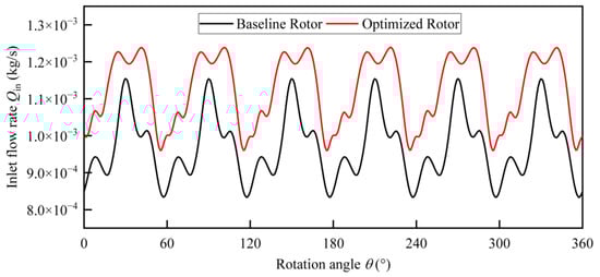 According to Figure 11, both the baseline and optimized rotors exhibit periodic mass flow pulsations that are tightly correlated with the rotor’s rotational cycle. This behavior is characteristic of Roots-type compressors, which operate based on the meshing motion of rotors that induces periodic variation in the working chamber volume. This volume fluctuation causes intermittent intake and discharge of gas, resulting in pulsatile flow at both the inlet and outlet. Specifically, as summarized in Table 2, the outlet mass flow rate increases by approximately 15.64%, indicating that the optimized geometry contributes to higher volumetric throughput without significantly altering the operating conditions. Moreover, the inlet flow from the optimized rotor exhibits more regular pulsation patterns, characterized by smoother peak-to-valley transitions. This improvement is a combined result of the stabilized intake and reduced internal leakage during rotor operation. According to leakage flow theory, minimizing inter-lobe or tip leakage not only increases effective gas delivery but also reduces energy loss due to unnecessary re-compression of backflow gas, thereby directly improving isentropic efficiency. This improvement stems from the refined rotor profile design which reduces flow resistance near the inlet port and mitigates flow separation and backflow. From a theoretical standpoint, this allows for more efficient utilization of the volumetric expansion created during the intake phase, thereby improving gas capture efficiency in accordance with the principles of unsteady compressible flow.