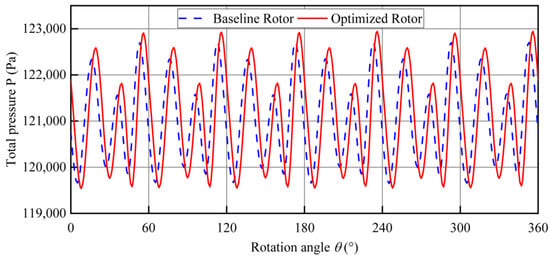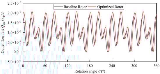 As shown in Figure 13, the exhaust pressure pulsation curves of the two rotors remain generally consistent, with only minor deviations observed at the peak values. Specifically, the optimized rotor exhibits a slightly higher maximum pressure and a slightly lower minimum pressure compared with the baseline, while the overall pulsation curve also demonstrates a subtle phase shift. This indicates that the adoption of a rotor composed of variable-radius arcs does not fundamentally alter the overall pulsation trend but instead introduces localized modifications in peak magnitudes and curve displacement. And the presence of this shift suggests that the primary effect of the optimized rotor lies not in redefining the pulsation pattern itself, but in fine-tuning the fluctuation characteristics and timing of pressure variations. Such behavior can be attributed to the refined rotor profile, which lowers inlet flow resistance, mitigates flow separation and backflow, and thereby alters the temporal progression of gas exchange. From a fluid-dynamic perspective, the curve displacement reflects adjustments in the phasing of the unsteady flow field, offering improved gas capture efficiency while maintaining overall pulsation stability.