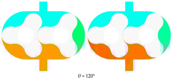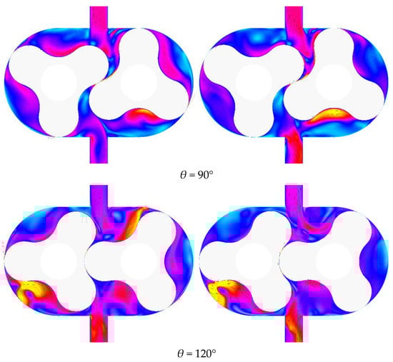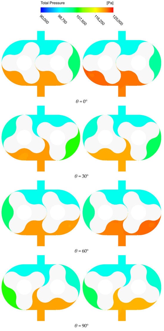 As shown in Figure 13, the overall trends in pressure field variation are similar for both rotor profiles under different rotation angles. However, the rotor with the optimized profile exhibits a slightly higher pressure in the exhaust chamber throughout the rotation cycle. This difference is particularly evident at rotation angles of 0°, 60°, and 120°, where the optimized rotor consistently shows elevated exhaust chamber pressure. The observed pressure increase can be attributed to the improved sealing effect of the optimized profile, which effectively reduces leakage losses during the exhaust phase. As a result, the optimized rotor enhances gas delivery efficiency and improves the overall performance of the pump.