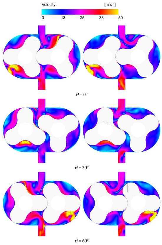 In contrast to the pressure field behavior, Figure 14 reveals distinct differences in the velocity field distribution between the two rotors. For the baseline rotor, localized high-velocity regions are observed at various rotation angles, particularly near the exhaust chamber, rotor clearances, and chamber walls. These regions promote turbulence and energy dissipation and may also cause localized heating and mechanical wear. At certain rotation angles—such as 30° and 60°—the baseline rotor further generates recirculation and vortex structures in the central pump chamber, which compromise flow stability and reduce pumping efficiency. In contrast, the optimized rotor exhibits a more uniform and stable flow structure across all rotation angles. High-velocity regions are markedly smaller and confined to natural exhaust pathways, which mitigates abrupt accelerations and strong shear flows. The velocity gradient within the pump chamber is smoother, and no significant secondary flows or large-scale vortices are observed, indicating that vortex formation is effectively suppressed and overall flow stability is improved.