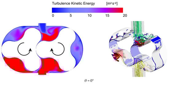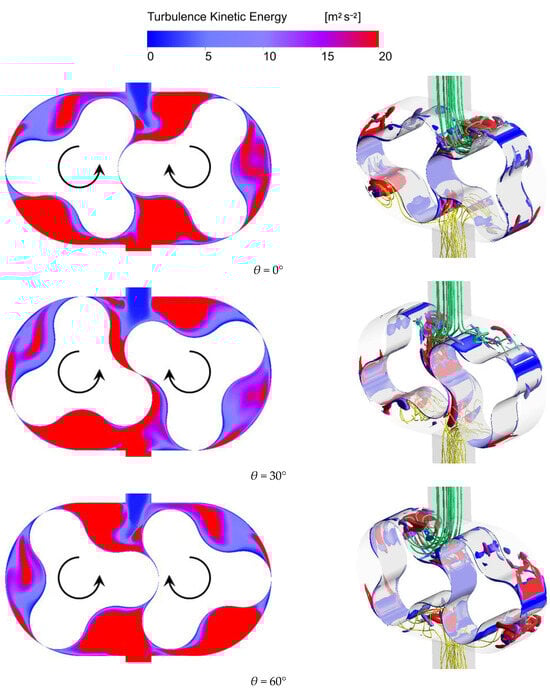 According to Figure 15 and Figure 16, the axial-plane distribution of TKE at various rotor angles θ reveals significant differences between the baseline and optimized rotors. For the baseline rotor, the TKE distribution exhibits strong disorder and high energy dissipation characteristics across all observed angles. At θ = 0°, high-TKE regions are widely distributed along the chamber boundaries and clearances where energy is extensively dissipated in the form of turbulence. As the angle increases to θ = 30°, although the location of high-TKE regions shifts due to rotor rotation, the overall area remains largely unchanged. At θ = 60° and 90°, the TKE distribution undergoes complex fluctuations in response to the changing meshing positions, reflecting the random nature of energy transfer within the flow field. This randomness impairs the efficiency of energy conversion into useful work, leading to considerable losses as TKE within disordered flows. In contrast, the optimized rotor demonstrates a more orderly and controllable TKE distribution across all rotational positions. At the initial angle of θ = 0°, the high-TKE zones are significantly reduced compared to the baseline case, confined primarily to localized regions near the rotor meshing surfaces and selected chamber walls. This indicates that the optimized profile effectively suppresses unnecessary flow disturbances in non-functional regions. As θ increases to 30° and 60°, the high-TKE zones maintain a “concentrated and structured” distribution pattern, with energy dissipation localized within essential shear and compression zones. Meanwhile, other areas exhibit significantly lower TKE levels, indicating that the optimized rotor effectively guides energy transmission along controlled paths and improves energy utilization efficiency. At θ = 90° and 120°, high-TKE regions migrate in a stable and predictable manner with rotor rotation, maintaining a consistent distribution pattern. This demonstrates the optimized profile’s superior capability in regulating energy transfer within the flow field, which contributes to the stable and efficient operation of the hydrogen circulation pump.