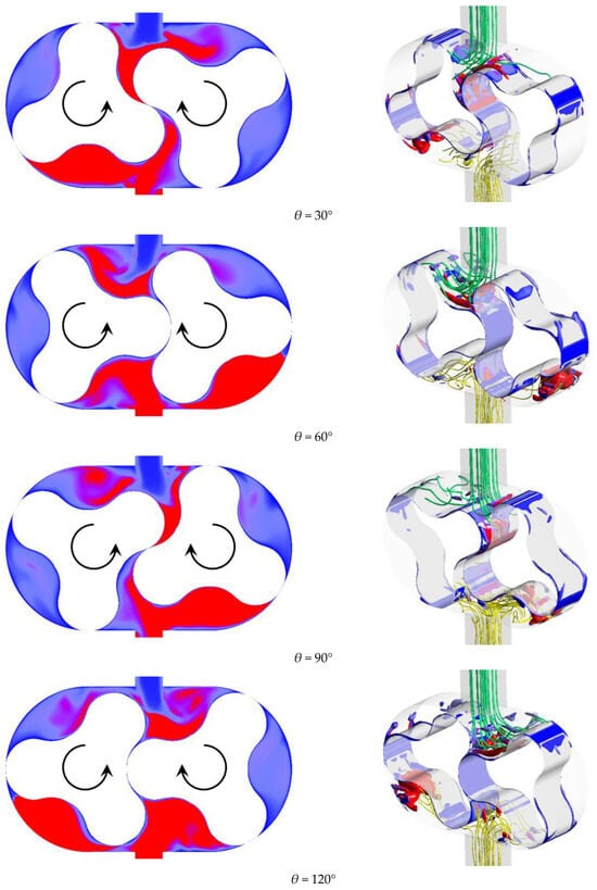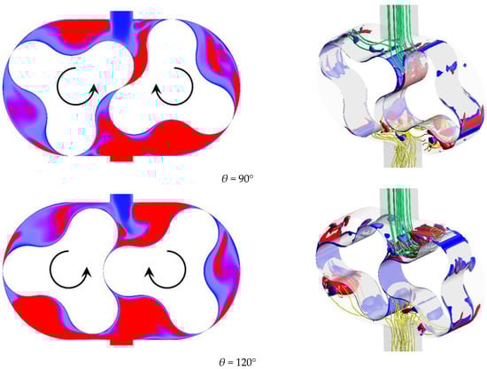 The three-dimensional vortex structures further highlight the contrast between the two rotors. For the baseline rotor, the vortex field is characterized by high levels of complexity, turbulence, and energy dissipation. At θ = 0°, large-scale vortex clusters dominate the domain, where vortices intertwine and merge to form intense dissipation zones. These vortex structures not only increase flow resistance but also continuously consume energy throughout the generation–breakdown–reformation cycles. As θ increases to 30°, the spatial configuration of the vortices changes, yet the disordered nature of the flow persists. The vortices become increasingly fragmented and dispersed, and multiscale vortex interactions further accelerate energy loss. At θ = 60° and 90°, the vortex field remains trapped in a chaotic cycle of “generation-dissipation-regeneration,” with frequent interactions between vortices, chamber walls, and meshing clearances intensifying flow losses. These observations reveal the baseline rotor’s limited ability to control vortex dynamics, thereby constraining flow stability and energy conversion efficiency. In contrast, the vortex structures of the optimized rotor exhibit clarity, order, and low energy dissipation. At θ = 0°, the vortices are organized as concentrated and controllable bundles with regular shapes that align well with the rotor profile, significantly reducing wall impingement and associated energy losses. As θ increases to 30° and 60°, the vortex structures evolve in an orderly manner along with the rotor motion. Their generation, development, and dissipation are guided by the rotor profile, exhibiting a pattern of “directional migration and orderly attenuation.” This prevents random vortex fragmentation and reduces unnecessary energy consumption. Even at θ = 90° and 120°, the vortex structures maintain their relatively simple and stable forms. The strength and extent of the vortices remain constrained by the rotor geometry, effectively suppressing vortex-vortex interference and minimizing additional energy losses. These characteristics collectively contribute to enhancing flow field stability and improving energy conversion efficiency.