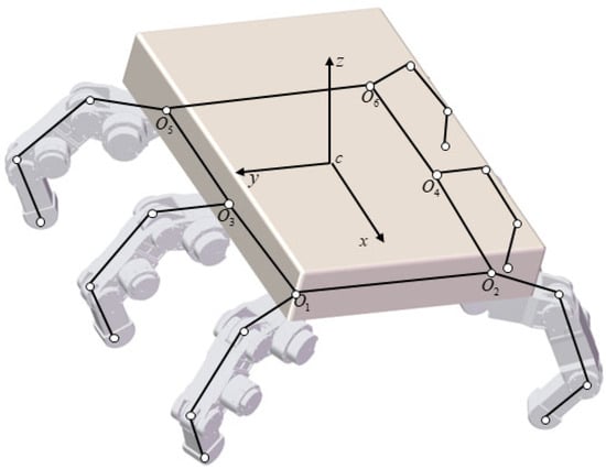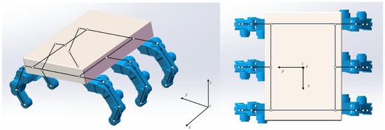 When a hexapod robot travels on rugged terrain, its torso will rise and fall with the terrain’s undulations. From a stability perspective, it is not conducive to the control of robots. For enhanced rugged terrain traversal, hexapod robots can adopt an optimal terrain adaptation strategy prior to full pose adjustment, aligning the torso plane with the best fit plane defined by supporting footholds while maintaining other pose parameters. This targeted torso–terrain parallelism significantly improves motion stability and maneuverability when navigating irregular surfaces. A structural model of a hexapod robot is shown in Figure 1.
