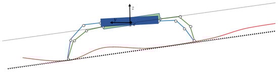 (2) When walking on inclined structured terrain, hexapod robots focus on their adaptability to complex terrains. Therefore, when the hexapod robot walks on an inclined road surface, the posture adjustment of the robot keeps the posture of the torso parallel to the inclined road surface, thereby improving the maneuverability of the robot, as shown in Figure 12. The angle of the slope in the figure is , the center of gravity of the robot is , and the projection of the robot’s center of gravity is .