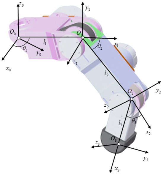 where is the coordinate of the robot body relative to the pose parameter, , in the geodetic coordinate system, and are the yaw angle, pitch angle, and roll angle, respectively. Taking the body coordinate system as the reference coordinate system, Figure 3 shows the D-H coordinate system of the robot leg. In the figure, represent the joint angle and trunk length, respectively. Multiplying adjacent D-H transformation matrices yields the transformation matrix, , from the foot coordinate system to the base coordinate system, which is as follows: