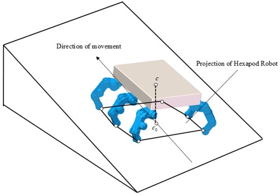The important feature of a hexapod robot is its adaptability to complex and unstructured terrain, which requires the robot to have high reliability and stability. The static stability margin for a hexapod robot is quantified as the shortest distance from the vertical projection of the robot’s center of mass within the support polygon to the nearest edge of this polygon. The larger the value of the stability margin, the higher the stability, and if a robot’s it may overturn. It indicates that the magnitude of the stability margin is directly related to the center of gravity position of the hexapod robot. Therefore, in order for hexapod robots to achieve stable walking on unstructured terrain, it is necessary to coordinate with the adjustment of the robot’s center of gravity position to improve its walking stability. The larger the stability margin of a hexapod robot, the more stable it is. When designing the gait of the robot, every step of the gait cycle is attempting to maximize its stability margin. Therefore, it is necessary to study the conditions for robots to achieve the maximum stability margin under various support conditions. For hexapod robots operating on flat terrain, all supporting feet remain coplanar within a horizontal support polygon, with the center of gravity inherently contained within this stability boundary. In contrast, traversing unstructured environments (slopes or rough terrain) typically results in non-coplanar footholds, necessitating the projection of both the center of gravity and support points onto a reference horizontal plane to calculate the effective stability margin. As shown in Figure 4, the hexagon on the slope is a projection of the hexapod robot.