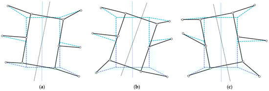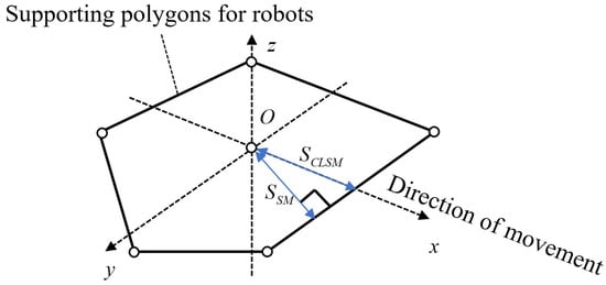 The stability margin, , refers to the projection of the center of gravity onto the supporting polygon. Figure 5 shows the centroid projection of the robot within the supporting polygon. In the figure, represents the stability margin of the robot, and represents the stability margin in the direction of motion. The shortest distance from the center of gravity to the supporting polygon edge can be expressed as follows: