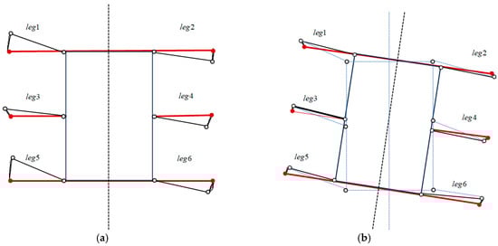 Figure 8 exemplifies adjustments from current to optimal poses. Dashed lines represent pre-adjustment poses; solid lines denote post-adjustment configurations. This pose adjustment rotates the robot’s torso to achieve coordinated motion between the torso and legs. The hexapod optimal pose method adjusts the entire robot pose—including center of gravity position and torso orientation, enhancing stability and flexibility. However, stability cannot be guaranteed with fewer supporting legs.