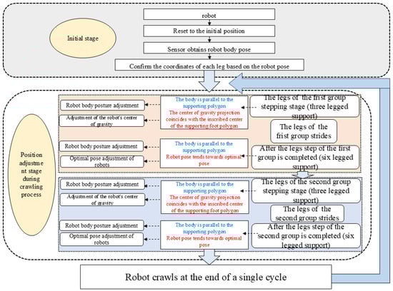 At this time, the three-legged gait is adopted. When the robot is supported by three legs at the beginning of the robot’s step, in order to reduce the interference of the swinging leg on the pose adjustment, the posture adjustment of the fuselage and the position adjustment of the center of gravity can be implemented. To enhance robot stability, body pose adjustment and optimal pose realignment are implemented during the six-leg support phase following step completion. The method implements phased active pose optimization to adjust fuselage pose and center of gravity position during the three-leg support period (initial three-leg stance when walking commences), leveraging the brief statically stable interval for pre-adjustment. At the beginning of the swing leg movement, the interference to the adjustment is minimized. The robot will actively tilt the fuselage to make it parallel to the supporting foot polygon, which can make the robot lift the center of gravity on the convex ground to avoid scratching, and reduce the fuselage on the concave ground to increase stability. Then, the center of gravity projection of the robot is shifted in advance to the direction of the swinging leg that is about to touch the ground. After the active pre-compensation of the walking leg is completed, the leg is swung. At this time, the body and legs of the robot move forward in linkage. Compared with the traditional method, the simple swinging leg has more smooth motion and stability, and it will also reduce the jitter in the process of the robot swinging a leg. At the end of the six-legged support period, the optimal pose algorithm will recalculate the support polygon based on the actual height difference of the landing point, and then adjust the optimal pose. The robot can automatically adjust the resultant force direction from the fuselage to the end of each foot on the convex ground, avoid single-leg suspension or overload, and reduce the unreasonable jitter or mutation of the robot. This strategy significantly improves the dynamic stability of the robot in the transition phase of action switching, enhances the terrain adaptability, optimizes the overall energy efficiency, controls the active attitude of the tripod support phase, and realizes the coordination of two-stage pose optimization, making up for the limitations of the traditional single-stage adjustment method.