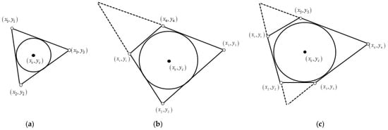 Maximum stability margin of the center of the inscribed circle supporting various polygons. (a) Inscribed circle center of triangle. (b) Inscribed circle center of quadrilateral. (c) Inscribed circle center of pentagon.