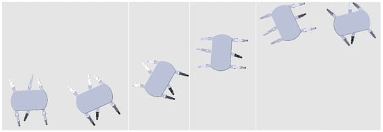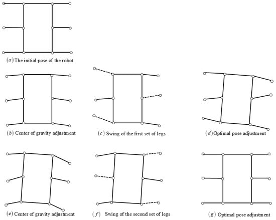 The dashed line in Figure 11 represents the lifting leg of the robot. Figure 11a shows the initial pose of the robot; Figure 11b shows the robot moving its center of gravity ahead of time to the center of the polygon formed by the supporting legs before performing the next step of swinging and lifting the legs; Figure 11c shows the swinging process of the first set of legs in the quadruped gait swing of the robot, with the legs indicated by the dashed line being the swinging legs; Figure 11d shows the optimal pose adjustment of the robot after the first leg swing is completed; Figure 11e shows the robot moving its center of gravity ahead of schedule to the center of the polygon formed by the supporting legs before the second leg swing and leg lift; Figure 11f shows the swinging process of the second set of legs in the quadruped gait swing of the robot, with the legs indicated by the dashed line being the swinging legs; and Figure 11g shows the optimal pose adjustment of the robot after the second leg swing is completed, returning to the initial pose of the robot.