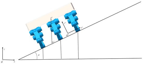 Firstly, adjust the hexapod robot to be parallel to the supporting end plane, that is, parallel to the water slope. Therefore, it is necessary to set the value of in the aircraft pose vector, , in the slope coordinate system to 0, while keeping the value of unchanged.