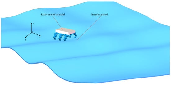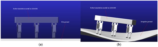 Adams simulation model of a hexapod robot in different terrains. (a) Hexapod robot in regular terrain. (b) Hexapod robot in irregular terrain.