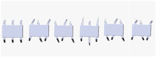 Thus, the value in the body pose vector, , is obtained, where the value of remains unchanged and the value of is 0. Thus, all values of the target pose vector, , of the aircraft relative to the geodetic coordinate system were determined. During the adjustment process, the position coordinate, , of the foot relative to the geodetic coordinate system remains unchanged from its original value. The coordinate value, , of the supporting end in the torso coordinate system during the swinging process can be obtained, and the corresponding leg joint angle, , can be obtained using inverse kinematics. Thus, the multi-legged robot can be adjusted to the optimal pose state.