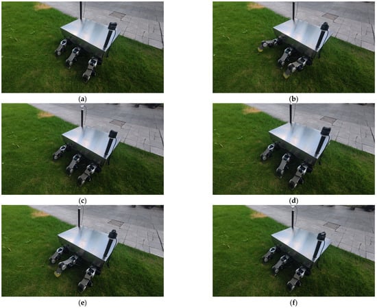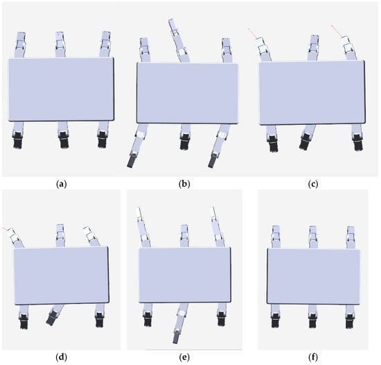 The attitude adjustment process of the hexapod robot prototype during a complete cycle of executing a triangular gait can be obtained from Figure 25. Figure 25f shows the initial posture of the robot, which is also the posture at the end of the cycle; Figure 25a shows the process of transferring the center of gravity to the center of the polygon formed by the next supporting leg before the robot prepares to lift the next leg; Figure 25b shows the swinging motion of the first set of legs in the quadruped gait of the robot; and Figure 25c shows that after the first set of leg swings is completed, the robot is in a hexapod support state and has undergone optimal posture adjustment, resulting in the better directionality and stability of the robot. The leg layout is reasonable and the flexibility is enhanced; Figure 25d shows the process of transferring the center of gravity to the center of the polygon formed by the next supporting leg before the robot prepares to lift the second leg; Figure 25e shows the swinging motion of the second set of legs during the quadruped gait of the robot; and Figure 25f once again shows that after the second set of leg swings is completed, the robot is in a hexapod support state and has undergone optimal posture adjustment, returning to its initial posture At this point, the robot has better directionality and stability, reasonable leg layout, and enhanced flexibility.