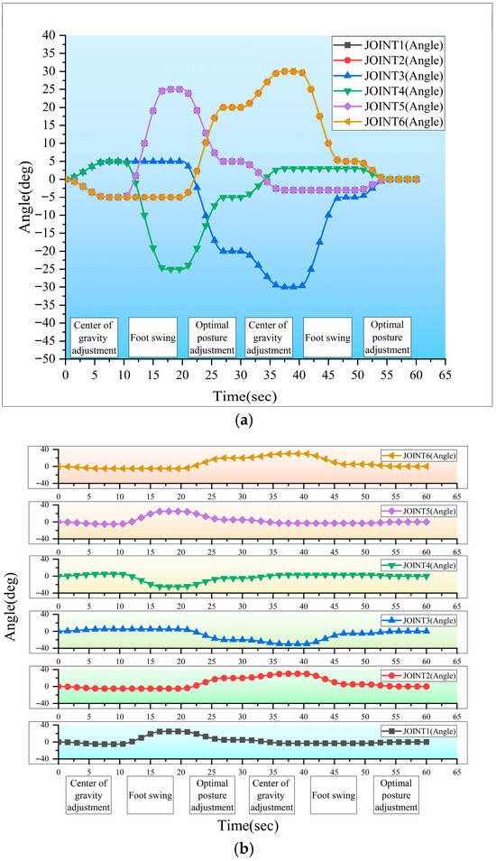 The curve changes during the pose adjustment process of each base joint of the hexapod robot shown in Figure 18. The 0–10 s in Figure 18 represent the process of adjusting the center of gravity, corresponding to the center of gravity adjustment of the robot before the next step of swinging and lifting the leg in Figure 17a. The 10–20 s in Figure 18 represent the process of swinging the legs, corresponding to Figure 17b, which shows the swinging process of the first set of legs in the robot’s three-legged gait swing. The 20–30 s in Figure 18 are the process of optimal pose adjustment, corresponding to Figure 17c, where the robot is in a hexapod supported state after the first leg swing is completed, and the robot undergoes optimal pose adjustment. The 30–40 s in Figure 18 correspond to Figure 17d, where the robot adjusts its center of gravity before performing the second swing leg lift. The 40–50 s in Figure 18 correspond to the swing process of the second leg of the robot’s three-legged gait swing shown in Figure 17e. The 40–50 s in Figure 18 correspond to Figure 17f, where the robot is in a hexapod supported state after the second leg swing is completed, and the optimal pose adjustment is performed on the robot.