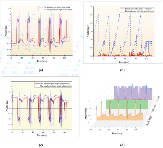 Figure 27 shows the comparison of the torso pose parameters of the robot prototype before and after adjustment. From Figure 27a–c, it can be seen that leg movements produce significant instantaneous peak fluctuations in the pitch angle, yaw angle, and roll angle during the gait alternation of the robot. After introducing posture adjustment, the peak deviation of these torso parameters can be quickly corrected in a short period of time, effectively preventing the accumulation of deviation from affecting subsequent gait movements. The blue line marked in the figure shows obvious instantaneous fluctuations in posture, which is a direct consequence of the failure to correct peak deviation in a timely manner. Comparative experiments have shown that attitude adjustment can efficiently suppress the amplitude of attitude transients and constrain robot attitude changes within a smaller range. This not only eliminates the adverse effects of peak fluctuations themselves, but also ensures the overall smoothness and efficiency of robot motion.