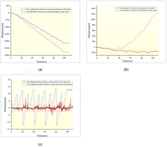 Comparison of X–Y–Z-direction offset values before and after pose adjustment of a hexapod robot. (a) Displacement in the X-direction before and after robot pose adjustment. (b) Offset distance in the Y-direction before and after robot pose adjustment. (c) Offset distance in the Z-direction before and after robot pose adjustment.