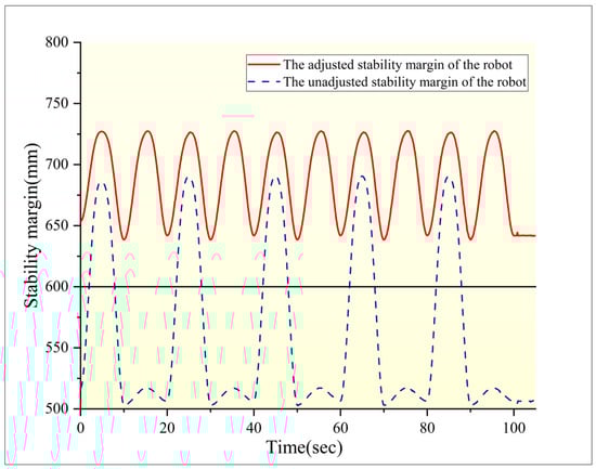 The changes in the stability margin curve of the hexapod robot before and after pose adjustment can be obtained from Figure 21. The red line segment in the figure represents the change curve of the stability margin of the adjusted robot during movement, which is also the distance of the robot’s center of gravity projected onto the supporting polygon. The blue line segment represents the stable margin variation curve of the robot after adjustment. During the movement of the robot, the supporting polygon and center of gravity of the robot will change with the movement and have a certain correlation with the gait. By adding pose adjustment to the robot during its movement, it can be seen from the figure that when the stability margin of the robot is too small, the pose adjustment of the robot can maintain the stability margin at a relatively high value, thereby ensuring the stability of the robot during its movement.