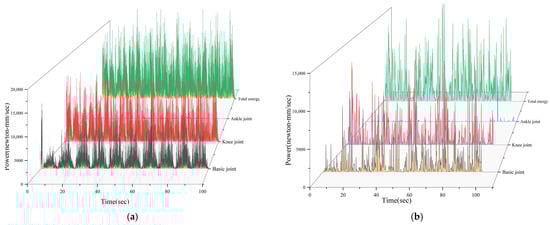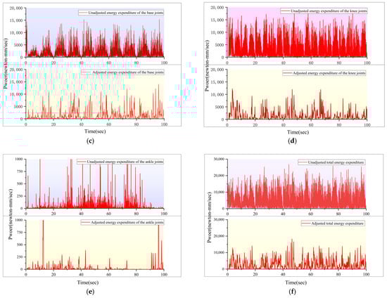Figure 22 shows the joint energy dissipation curves before and after pose adjustment of a hexapod robot. Figure 22a shows the three types of joints without posture adjustment and the total energy consumption during the robot’s motion process; Figure 22b shows the three types of joints without posture adjustment and the total energy consumption during the robot’s motion process; and Figure 22c–f show the comparison of the energy effects of the base joint, knee joint, ankle joint, and total sum of robot motion with and without attitude adjustment, respectively. The upper part of the graph represents the curve without posture adjustment, while the lower part represents the curve with posture adjustment added. Due to the attitude adjustment added during the robot’s motion, the offset values in the X–Y–Z-directions and the additional offsets in the pitch, yaw, and roll angles can be reduced, thereby reducing unnecessary motion and improving the robot’s operational efficiency. From the figure, it can be concluded that the energy consumption of the robot’s base joints, knee joints, and ankle joints is lower compared to the energy consumption without posture adjustment.