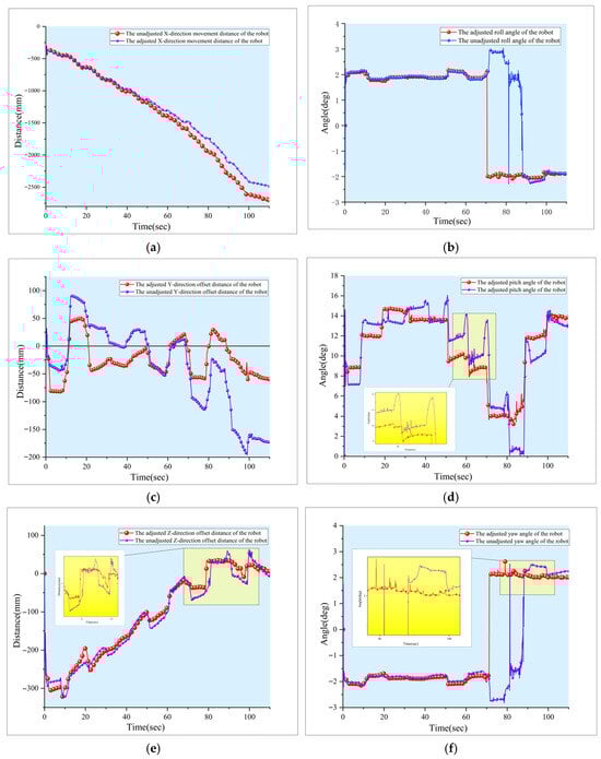 Curve comparison of pose parameters before and after adjustment of a hexapod robot. (a) Displacement in the X-direction before and after robot pose adjustment. (b) Roll angle curves before and after robot pose adjustment. (c) Offset distance in the Y-direction before and after robot pose adjustment. (d) Pitch angle curves before and after robot pose adjustment. (e) Offset distance in the Z-direction before and after robot pose adjustment. (f) Yaw angle curves before and after robot pose adjustment.