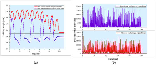 The stability margin and energy consumption of robots during their movement in irregular terrain can be obtained from Figure 24. The robot is in the process of moving. Adding pose adjustment to the robot during its motion, the pose adjustment is performed when the stability margin of the robot is too small, to maintain the stability margin of the robot at a relatively high value, thereby ensuring the stability of the robot during motion. In addition, it can be seen from Figure 24b that, after attitude adjustment, the robot reduced unnecessary movement such as robot offset, and the energy consumption of the robot was lower compared to the energy consumption without attitude adjustment, which improved the operating efficiency of the robot.