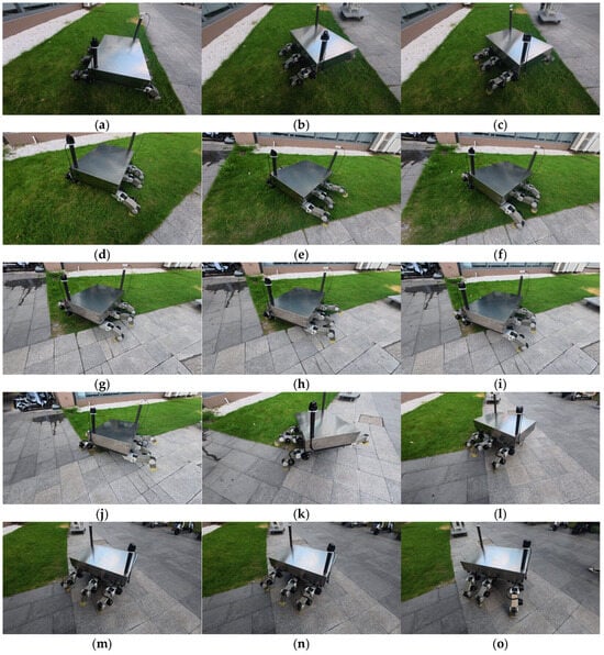 Figure 26 shows the motion process of the hexapod robot prototype with pose adjustment added. Figure 26c,h,k, and n show the robot keeping the body parallel to the supporting polygon formed by the landing point of the supporting foot. Figure 26e and m show the process of the robot adjusting its center of gravity before swinging its legs, transferring the center of gravity to the center of the polygon formed by the next set of supporting feet. Figure 26g,i,l, and o represent the optimal pose adjustment of the robot after swinging its legs.